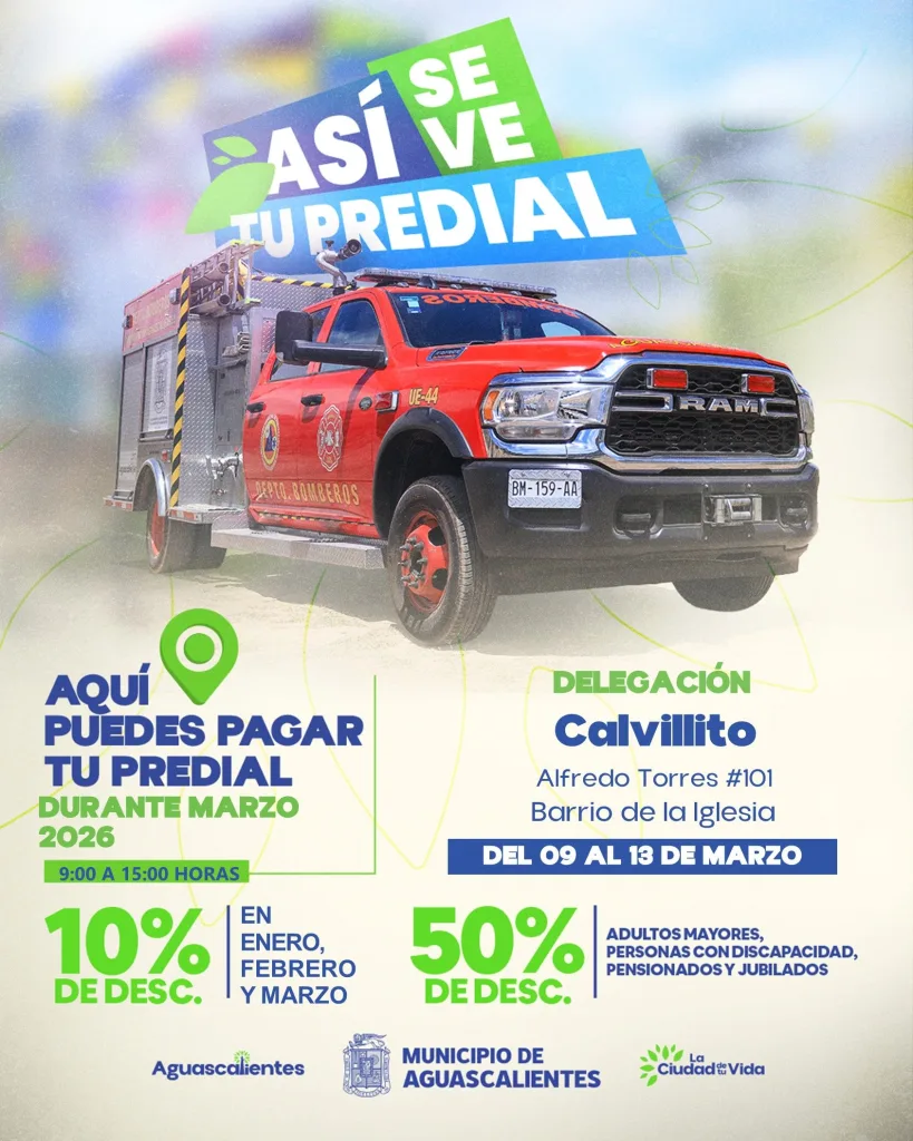 El Municipio de Aguascalientes informó que, a través de la Secretaría de Finanzas del Municipio de Aguascalientes, se habilitará una caja temporal para el pago del impuesto predial en la delegación Calvillito. Este módulo estará ubicado en la calle Alfredo Torres número 101, en el Barrio de la Iglesia, con el objetivo de acercar este servicio a los habitantes de la zona.