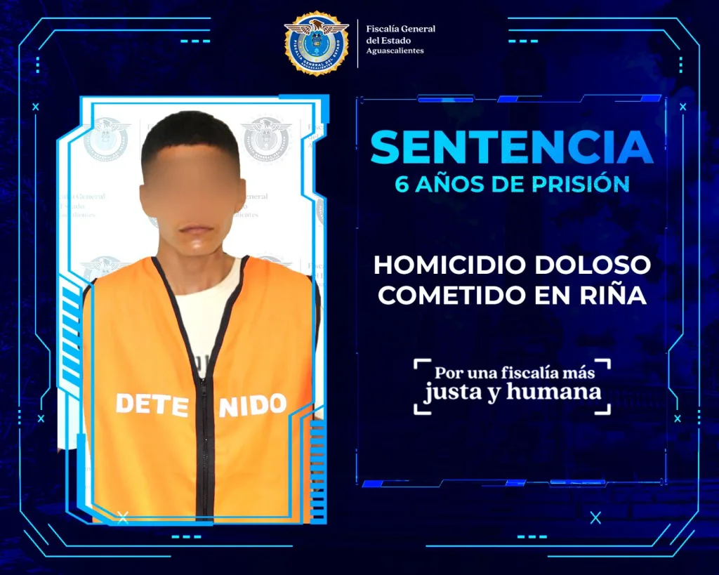 La Fiscalía General del Estado de Aguascalientes obtuvo una sentencia condenatoria en contra de Didier Alejandro, alias “Malacara”, por el delito de homicidio doloso cometido en riña, derivado de los hechos ocurridos en la comunidad de Cañada Honda, Aguascalientes.