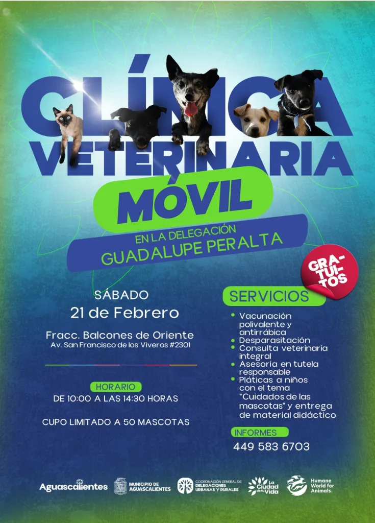 El Municipio de Aguascalientes anunció el arranque del Programa de la Clínica Veterinaria Móvil 2026, iniciativa que busca promover el bienestar y la salud de los animales de compañía mediante acciones preventivas y servicios gratuitos. Este proyecto se realiza gracias al trabajo conjunto entre la Coordinación General de Delegaciones Urbanas y Rurales y la organización Humane World for Animals, con el propósito de fomentar la tutela responsable y acercar atención veterinaria a diversas zonas del municipio.
