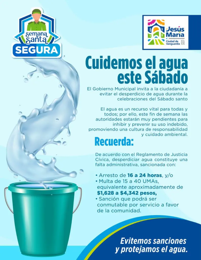El Gobierno Municipal de Jesús María hizo un llamado a la ciudadanía para evitar el desperdicio de agua durante la celebración del Sábado de Gloria y fomentar el uso responsable de este recurso vital. La autoridad municipal destacó la importancia de mantener prácticas conscientes que contribuyan al cuidado del medio ambiente y al bienestar colectivo.