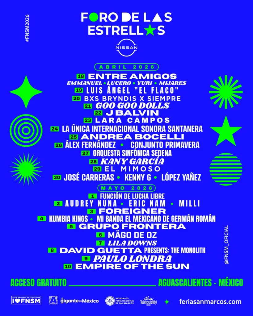 La Feria Nacional de San Marcos 2026 ya tiene listo uno de sus principales atractivos: el Foro de las Estrellas, que del 18 de abril al 10 de mayo ofrecerá una cartelera de primer nivel con conciertos gratuitos para todos los públicos. Este espacio se consolida como el corazón musical de la feria más importante de México, al reunir a artistas internacionales, leyendas de la música y exponentes del regional mexicano en un mismo escenario.