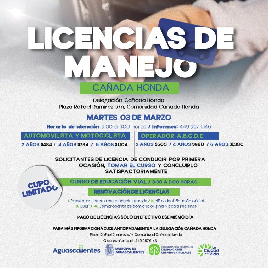 Las y los interesados podrán presentarse el martes 3 de marzo en la Plaza Rafael Ramírez s/n, en la comunidad Cañada Honda, en un horario de 9:00 a 11:00 horas, para realizar la renovación de licencias de motociclista, automovilista y operador tipo A, B, C, D y E. Será indispensable acudir con licencia vencida, identificación oficial, CURP y comprobante de domicilio, además de efectuar el pago en efectivo, que va de 484 a mil 380 pesos, según el tipo y vigencia solicitada.