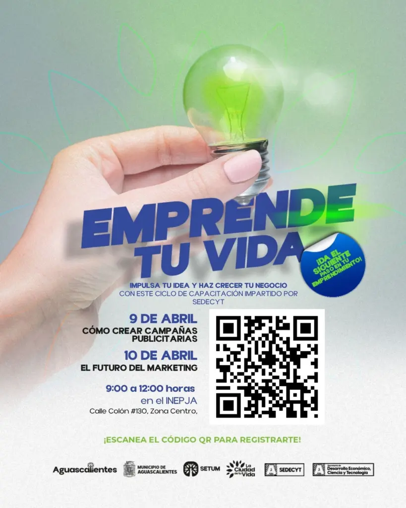 Con el objetivo de fortalecer el desarrollo económico local, el Municipio de Aguascalientes, a través de la Secretaría de Economía Social y Turismo Municipal, lanzó la invitación para participar en el programa “Emprende tu Vida”, una iniciativa dirigida a emprendedores que buscan crear o consolidar sus negocios. Las capacitaciones se llevarán a cabo los días 9 y 10 de abril y serán impartidas por la Secretaría de Desarrollo Económico, Ciencia y Tecnología, con el propósito de brindar herramientas prácticas que fortalezcan la toma de decisiones en el ámbito empresarial.