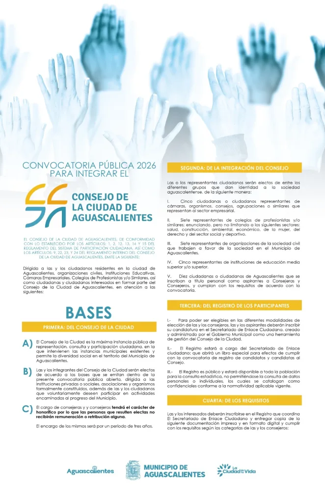 El Ayuntamiento de Aguascalientes informó que está por concluir la convocatoria pública para integrarse al Consejo de la Ciudad, cuyo registro cerrará el martes 24 de febrero de 2026. Esta iniciativa busca fortalecer la participación ciudadana en la toma de decisiones públicas y promover el desarrollo del municipio mediante la colaboración entre autoridades, organizaciones e integrantes de la sociedad civil.