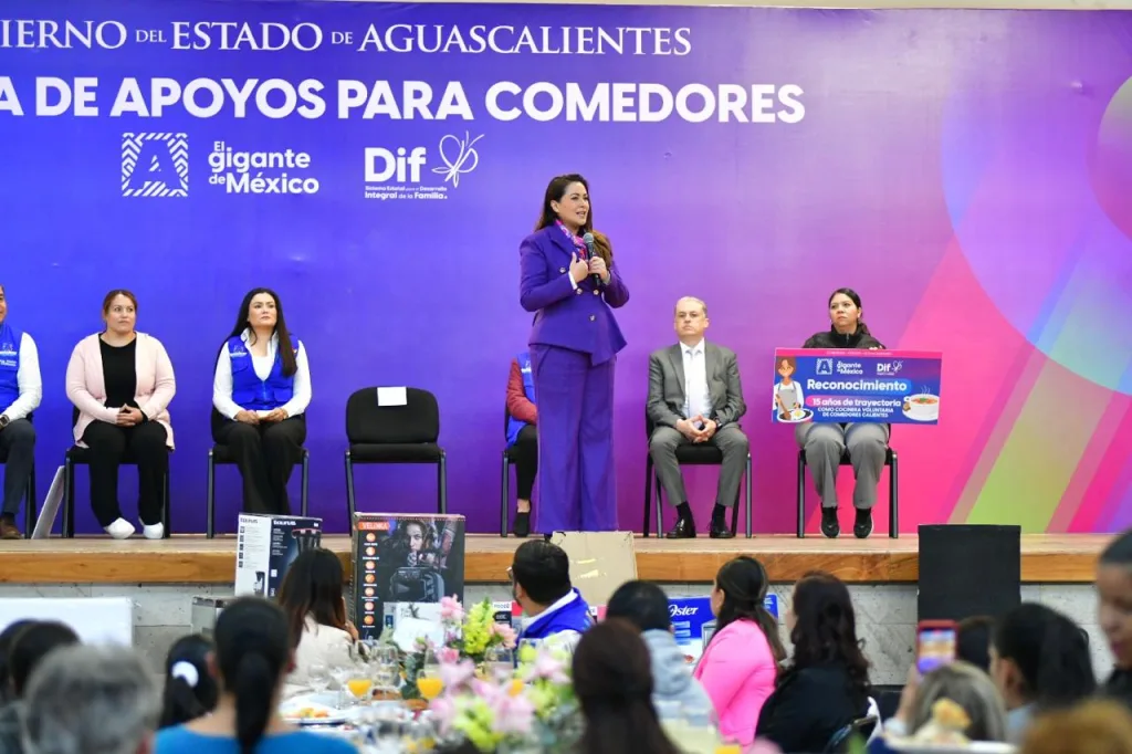 La gobernadora de Aguascalientes, Tere Jiménez, encabezó la entrega de mobiliario y equipo para fortalecer 263 comedores Escolares, Comunitarios y de las Casas del Bien Común que forman parte del programa Desayunos Calientes del DIF Estatal, beneficiando de manera directa a más de 15 mil 900 personas todos los días. Esta acción refrenda el compromiso del Gobierno del Estado con la alimentación y el bienestar de la niñez y las familias aguascalentenses.