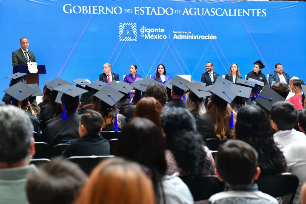 Aguascalientes apoya la educación continua de servidores públicos y sus familias, graduando a 146 personas con bachillerato y carrera profesional.