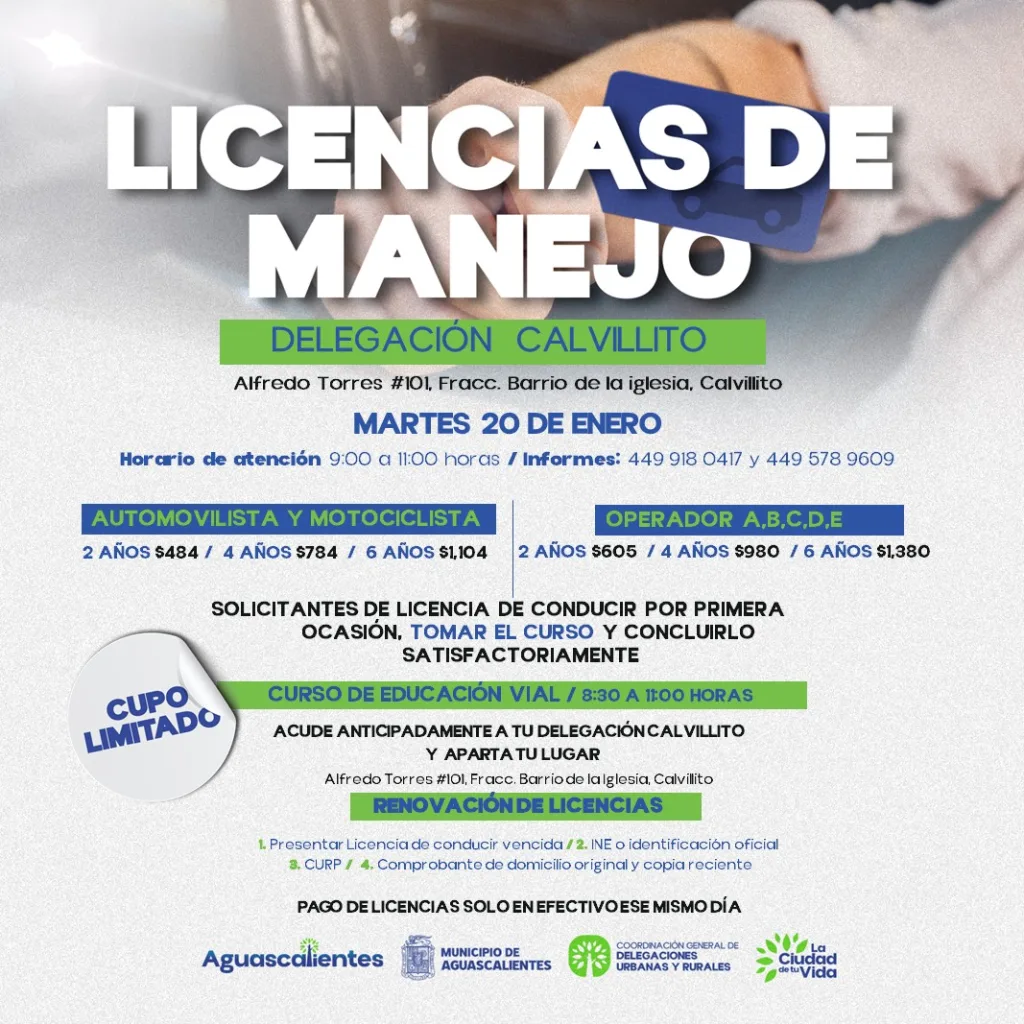 Este 20 de enero se realizará en Calvillito la primera jornada 2026 de renovación de licencias de manejo para la ciudadanía.