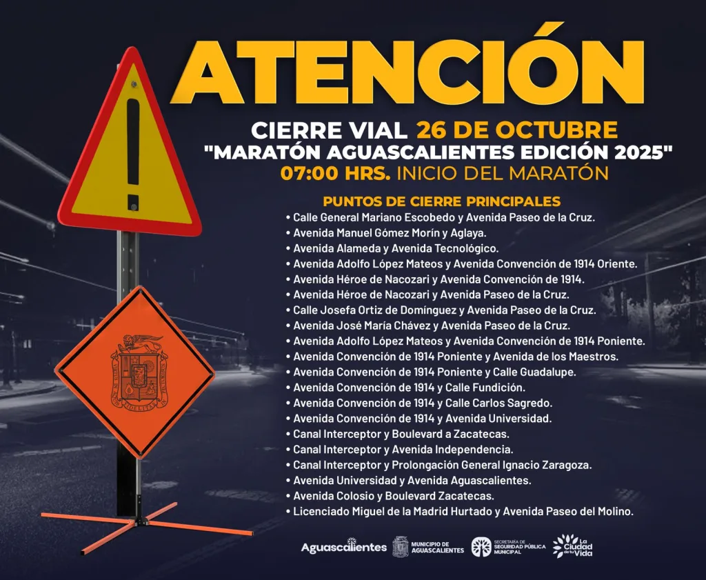 SPM anuncia cierres viales por el Maratón Aguascalientes 2025 e invita a usar rutas alternas y atender indicaciones viales. Implementarán cierres viales por el “Maratón Aguascalientes 2025” este domingo La Secretaría de Seguridad Pública Municipal (SSPM), a través de la Dirección de Movilidad y Tránsito, anunció los cierres viales que se aplicarán con motivo del […]
