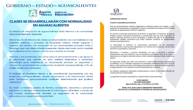 Por su parte, la Universidad Autónoma de Aguascalientes (UAA) también difundió, de manera independiente, su propio comunicado el 22 de febrero. La institución precisó que las clases se desarrollarían conforme al calendario establecido; sin embargo, indicó que los alumnos foráneos que enfrentaran complicaciones para trasladarse podrían justificar su inasistencia, privilegiando en todo momento la seguridad de la comunidad universitaria.