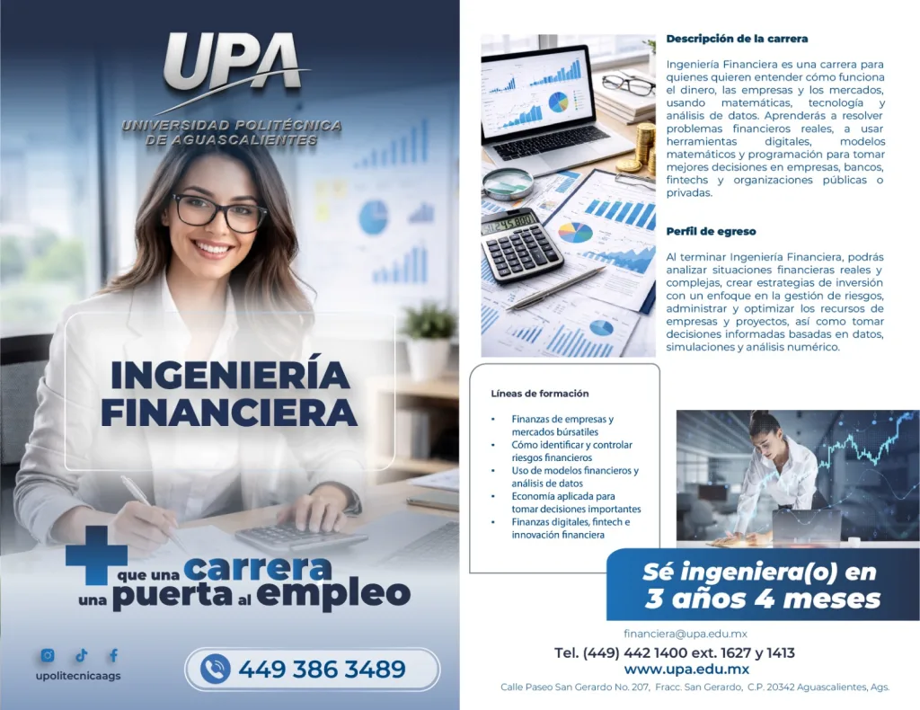 La Universidad Politécnica de Aguascalientes (UPA) anunció la apertura de la nueva carrera de Ingeniería Financiera, una opción académica dirigida a jóvenes interesados en analizar y administrar recursos dentro de empresas y organizaciones. Con este nuevo programa educativo, la institución busca fortalecer la formación de profesionales capaces de comprender el funcionamiento de los negocios, las inversiones y los mercados financieros.